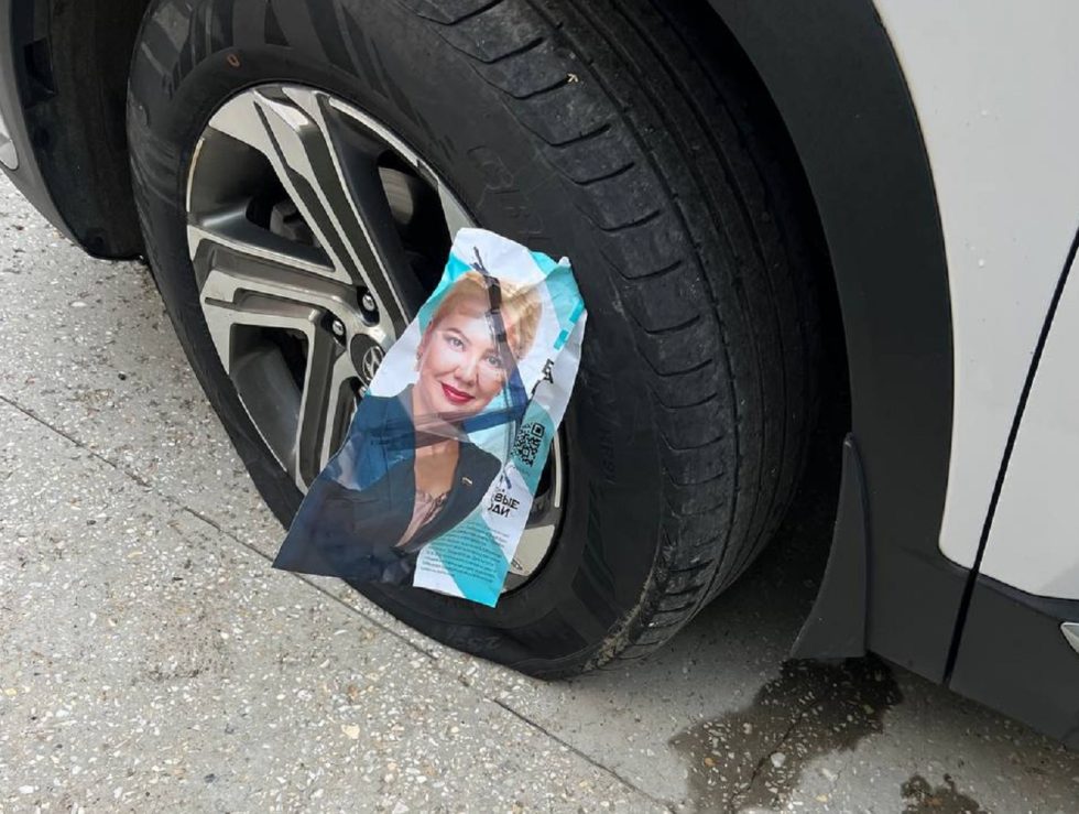 Кандидат в губернаторы Оренбургской области от партии «Новые Люди» Екатерина Калегина сообщила, что неизвестные прокололи колесо ее машины и в порез воткнули агиткалендарь с перечеркнутым изображением.
