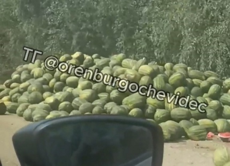 По словам очевидцев, ДТП произошло накануне, 21 августа, на участке трассы Оренбург-Соль-Илецк. Фура груженая арбузами съехала с дороги и опрокинулась на бок. В результате из кузова рассыпались арбузы.