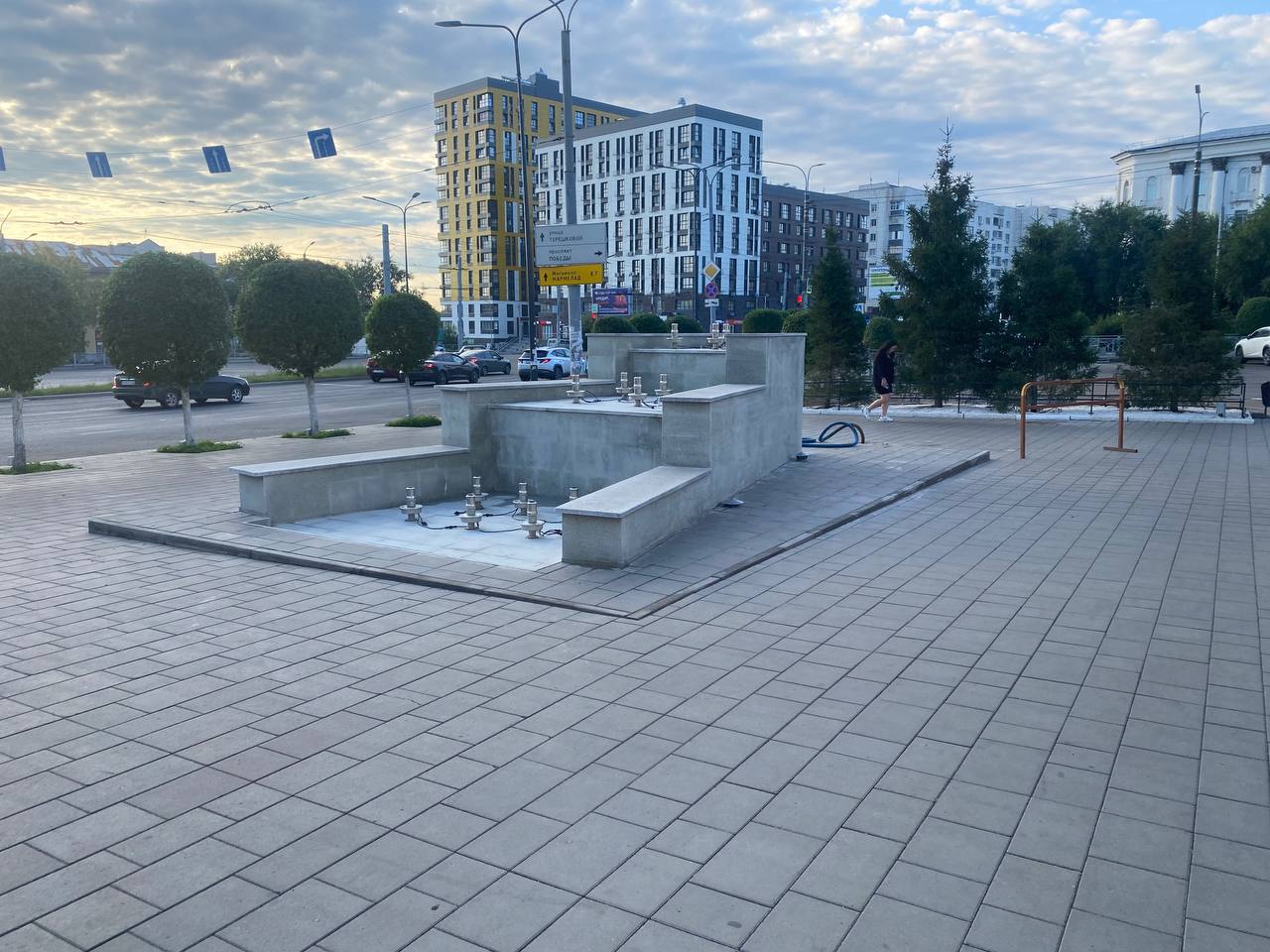 Фонтан оформлен в том же стиле, что и вся площадь — в бело-серых тонах. Дата открытия объекта и подключения фонтана пока не названа.