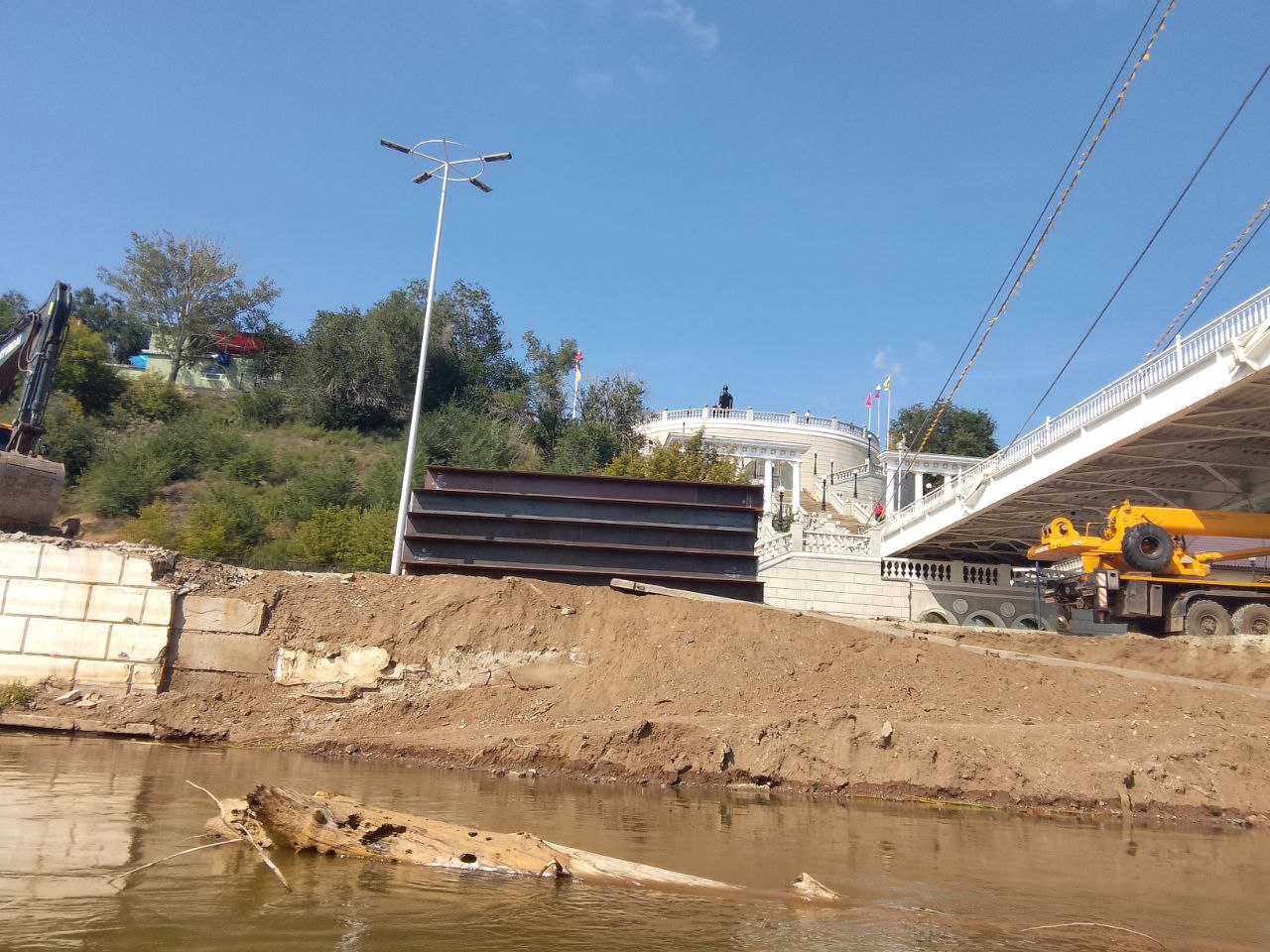 На набережную привезли металлические шпунты в подпорную стену. Ее восстановление — самая масштабная и трудоемкая часть работ на набережной. Шпунты должны удержать подпорную стену в паводок.