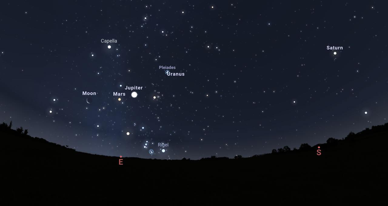 Наблюдать можно будет уже с полуночи: убывающая Луна, Марс и Юпитер. Обе планеты видны невооруженным глазом: Марс — красный, Юпитер — желтоватый. В районе Плеяд находится Уран, который можно увидеть только в бинокль. Около 4 утра на востоке появится Меркурий, но его будет сложно заметить из-за близкого рассвета.
