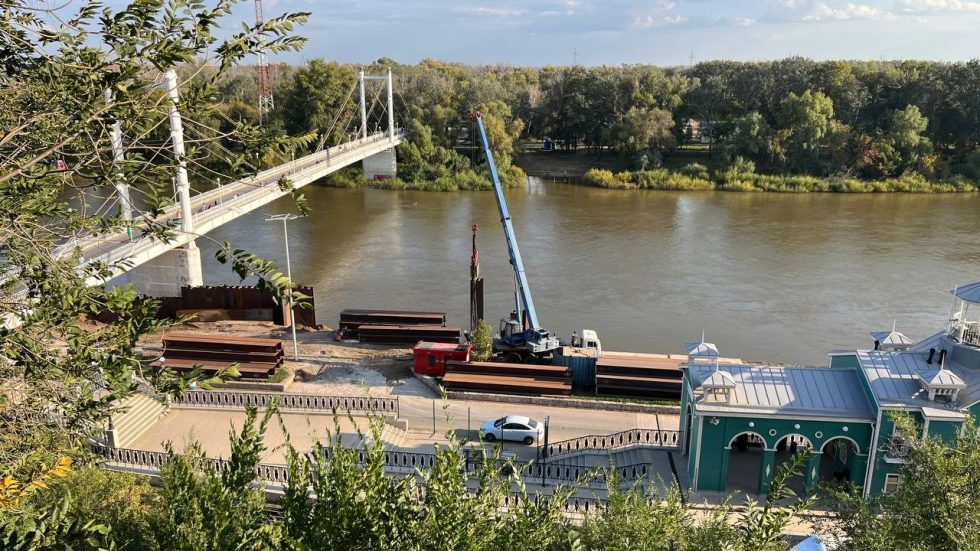 Для укрепления берега Урала подрядчик ООО «Су-56» продолжает монтировать 10-метровые металлические шпунты методом вибропогружения.
