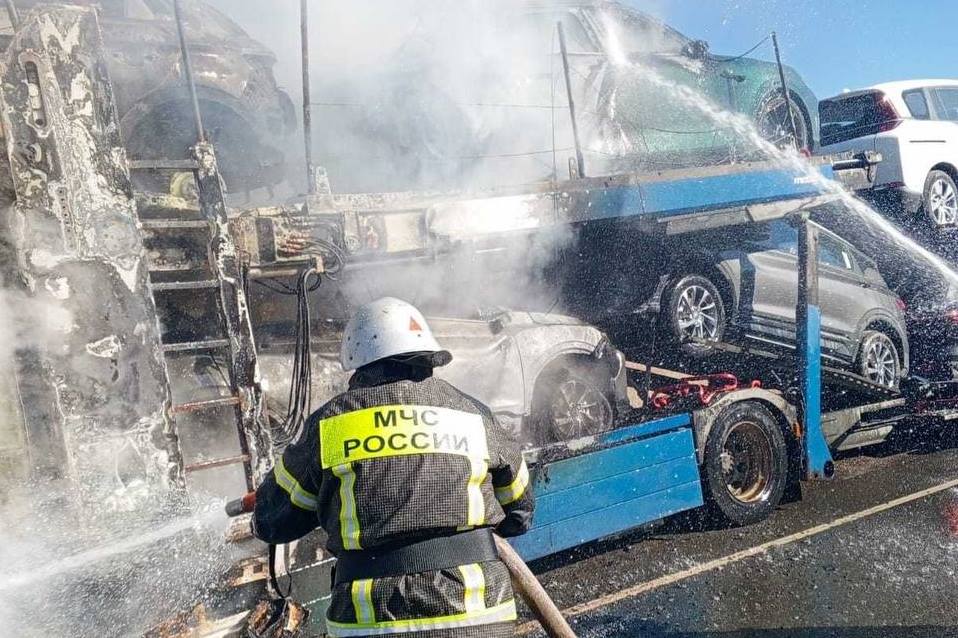 На месте происшествия работали спасатели 14 ПСЧ регионального МЧС. Возгорание оперативно ликвидировали. Пламя повредило четыре автомобиля, находившихся в прицепе.