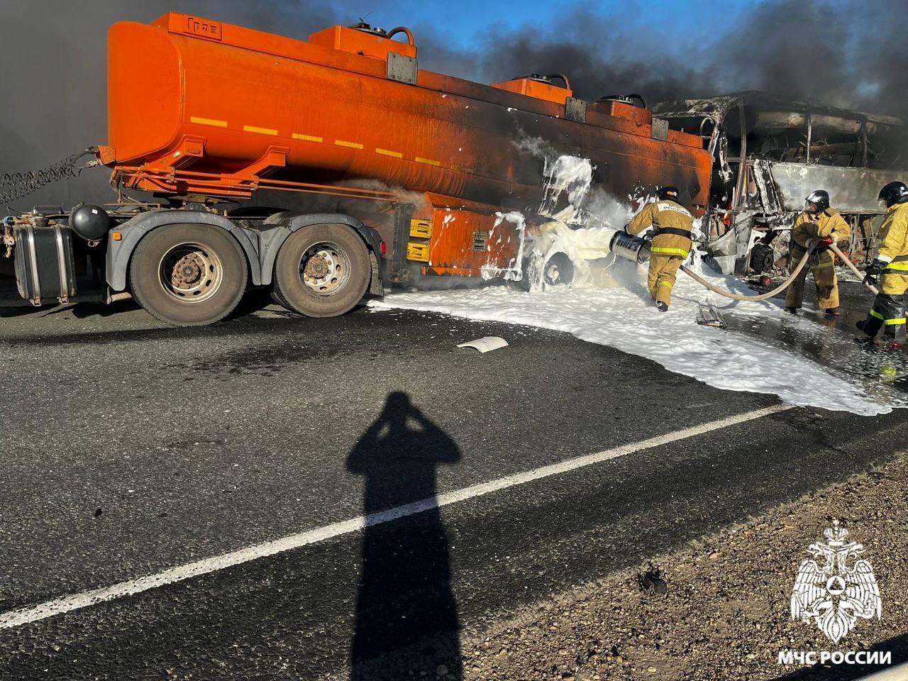 В результате столкновения транспортные средства загорелись. Пламя перебросилось на сухую траву и лесополосу вдоль трассы. На месте происшествия работают расчеты МЧС, они ликвидируют последствия ДТП.