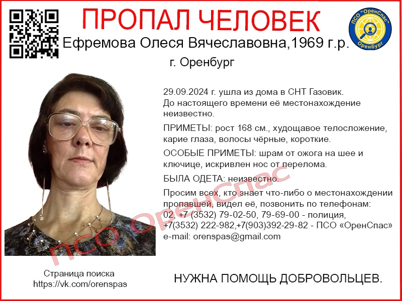Женщина 1969 года рождения пропала 29 сентября 2024 года. Она ушла из дома в СНТ Газовик и не вернулась. До настоящего времени местонахождение оренбурженки не установлено.