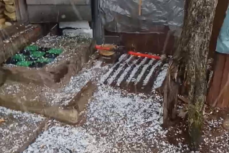 Судя по кадрам записи, град выпал размером с приличную горошину. Ледышки покрыли землю плотным ковром за несколько минут.