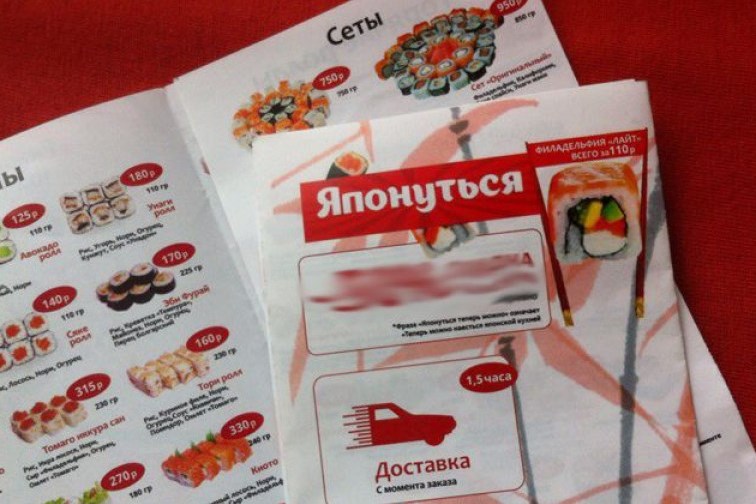 Листовки обнаружили в одном из магазинов «Бочка». Они рекламировали услуги по доставке еды из сети кафе-баров «Хорошая компания». При этом в тексте предложения содержались слова «Японуться/вкусная еда…».