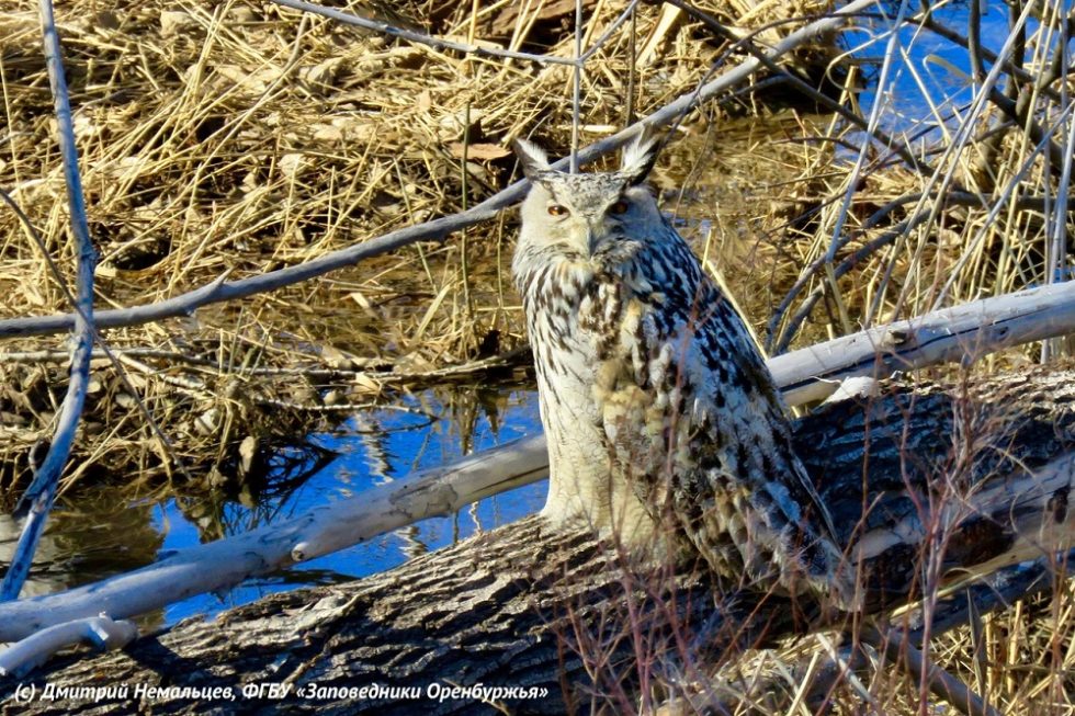 Государственные инспекторы ФГБУ «Заповедники Оренбуржья» во время рейда по заповедной территории увидели пестрого филина, который поджидал добычу.