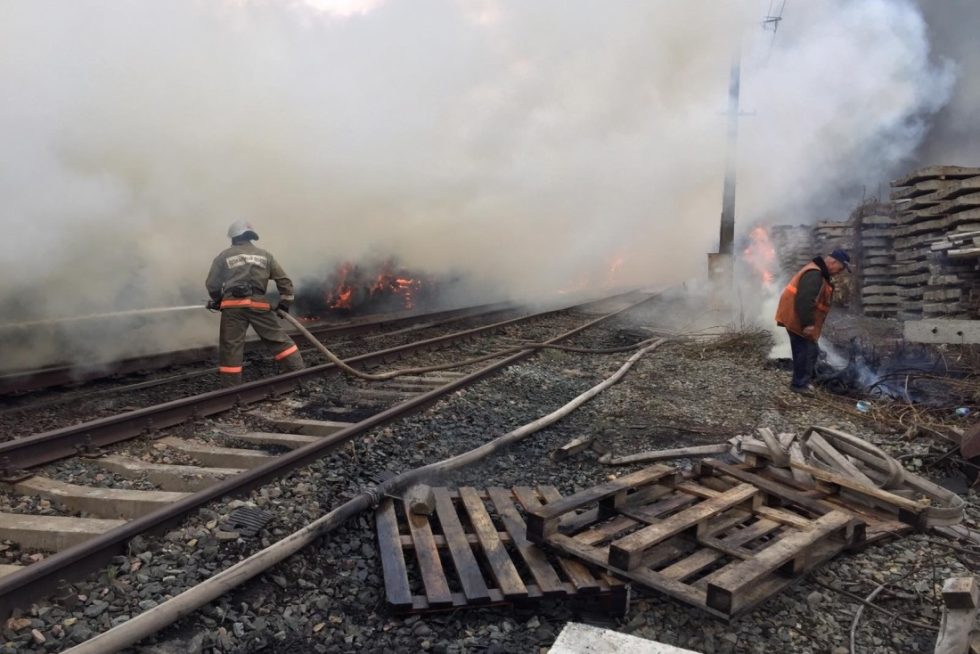 Сообщение о пожаре поступило в 12.37, горели складируемые шпалы на открытой площадке на территории путевой машинной станции по улице Шоссейной. На месте происшествия по второму повышенному номеру сложности пожара работали девять единиц спецтехники. Также к ликвидации огня привлекли пожарный поезд.