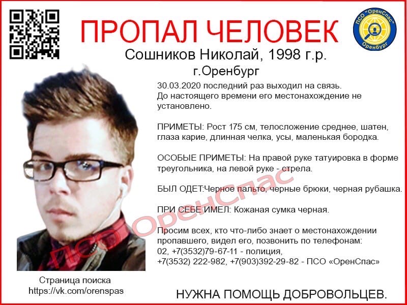Всех, кто что-либо знает о местонахождении Николая Сошникова, просят позвонить по телефонам: 02, +7(3532)79-67-11 — полиция, +7(3532) 222-982, +7(903)392-29-82 — ПСО «ОренСпас».