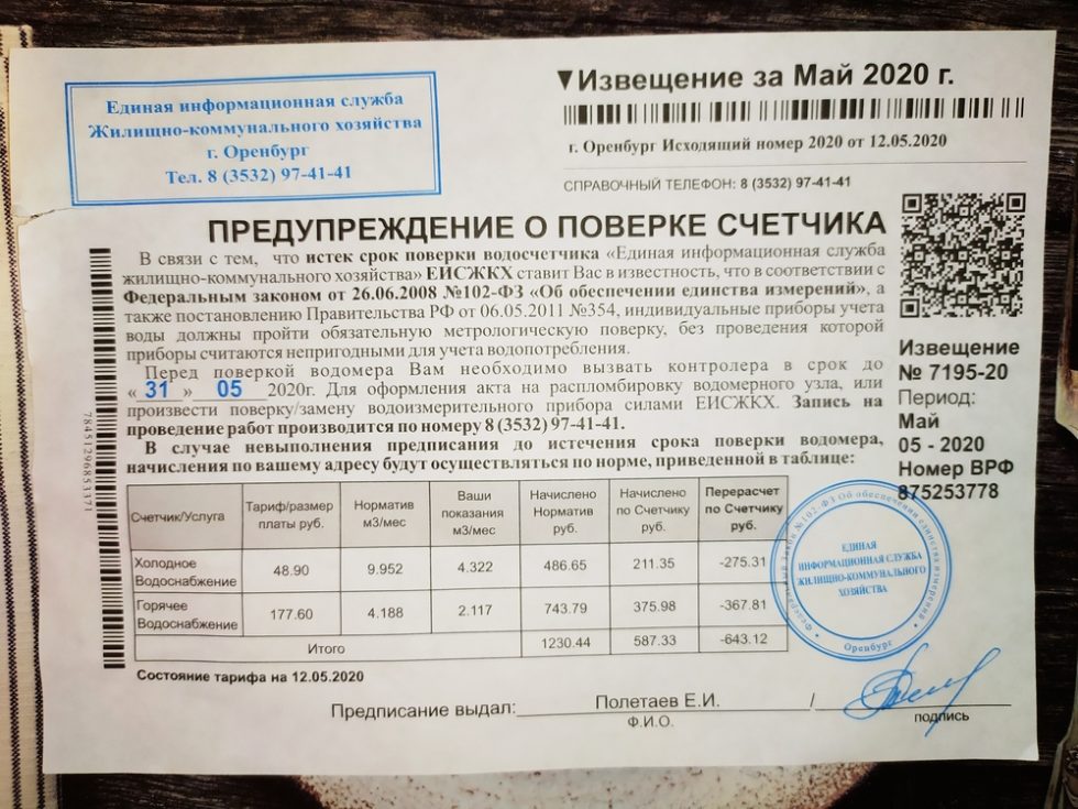Авторы подобных уведомлений не имеют никакого отношения ни к органам муниципальной власти, ни к ресурсоснабжающим организациям, а стоимость услуг у них зачастую завышена по сравнению с официально аккредитованными организациями. Напоминаем, что срок эксплуатации счетчика горячей воды до поверки составляет 4-6 лет. Информацию о межповерочном интервале и дату установки можно найти в паспорте прибора.