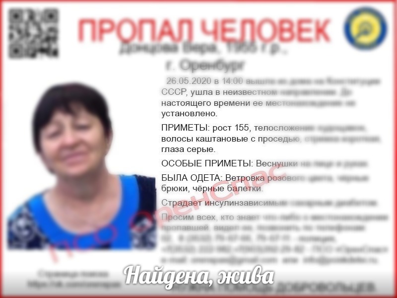 Напомним, жительница Оренбурга 26 мая 2020 года ушла из дома по улице Конституции СССР 24/1 в неизвестном направлении и пропала. Поисками пропавшей занимались сотрудники полиции и волонтёры ПСО «ОренСпас».
