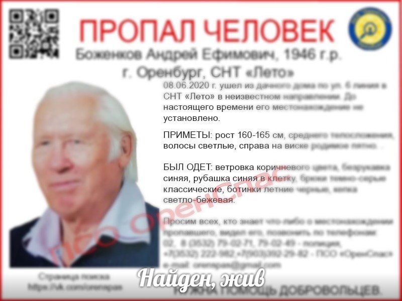 Напомним, 8 июня около 16 часов пенсионер ушёл из СНТ «Лето» Нежинского сельсовета в неизвестном направлении и пропал. Его поисками занимались сотрудники полиции и волонтёры ПСО «ОренСпас». Они провели две поисковые операции на местности, которые не дали результата.