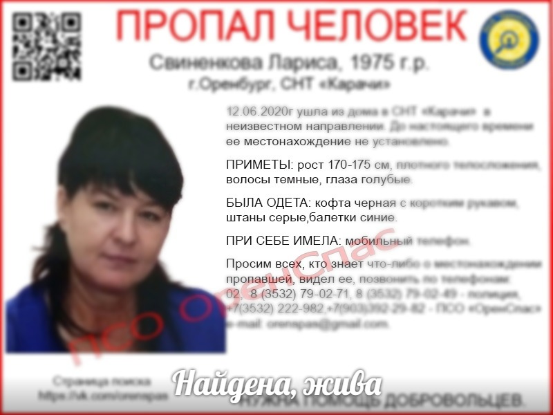 Лариса Свиненкова была найдена накануне, 18 июня, в одном из районов областного центра, сообщили «Оренбург Медиа» в поисково-спасательном отряде «ОренСпас».