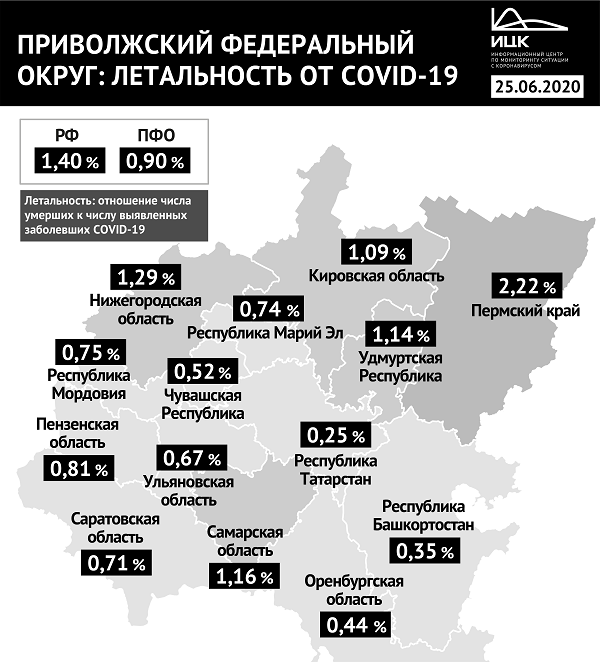В Приволжском федеральном округе в тройку регионов-лидеров с самой высокой летальностью вошли Пермский край (2,22%), Нижегородская область (1,29%) и Самарская область (1,16%).