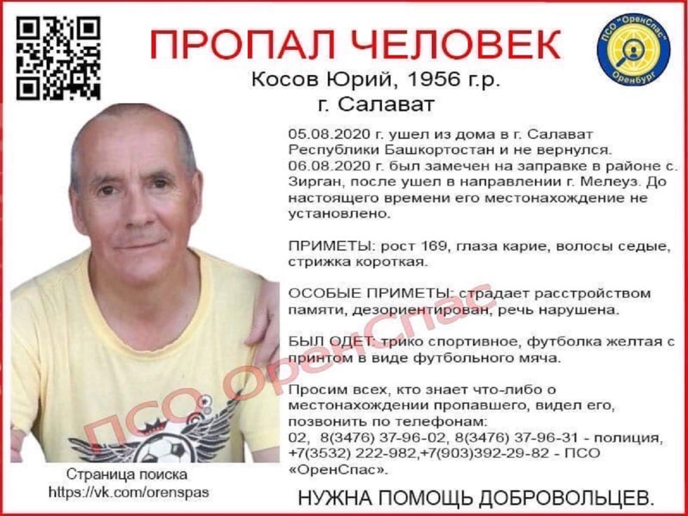 Всех, кто что-либо знает о местонахождении Юрия Косова или видел его, просят сообщить по телефонам: 02, 8(3476) 37-96-02, 8(3476) 37-96-31 — полиция, +7(3532) 222-982,+7(903)392-29-82 — ПСО «ОренСпас».