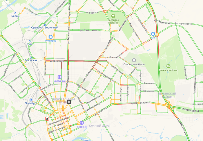 Водители сообщают, что в пятницу вечером в Оренбурге снова фиксируют пробки и дорожные заторы.