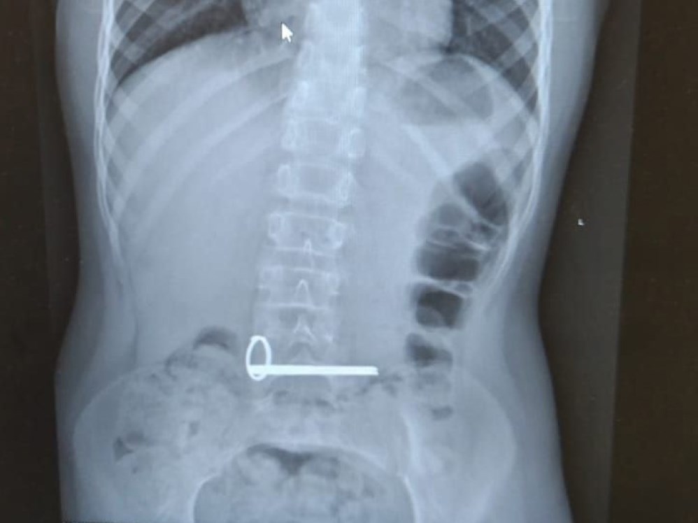 В отделение экстренной помощи областной детской больницы ребенка с инородным телом в желудке доставили ночью. Снимок показал наличие в ЖКТ школьника связки ключей.
