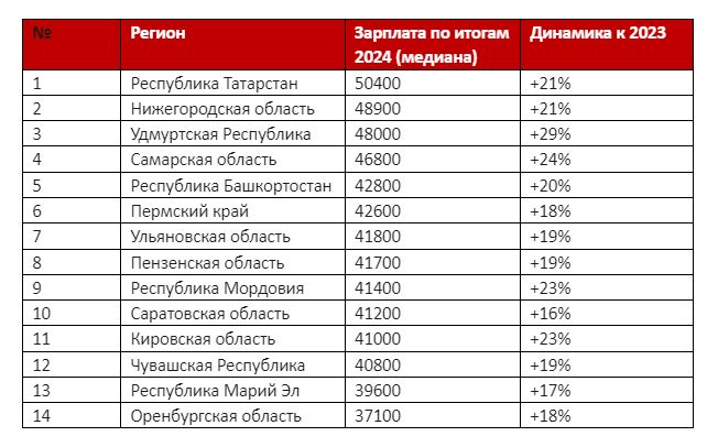 Что касается заработных плат, то самые высокие предложения вновь поступают из Татарстана — 50,4 тысячи рублей (+21% к 2023 году), за ним следуют Нижегородская область с 48,9 тысячи рублей (+21%) и Удмуртия с 48 тысячами рублей (+29%). Наименьшие доходы предлагаются в Оренбургской области — всего 37,1 тысячи рублей (+18%).