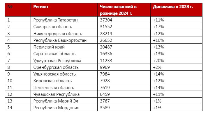 Лидером по количеству вакансий в розничной торговле стал Татарстан, где было открыто 37,3 тысячи позиций, что на 11% больше, чем в прошлом году. В то же время наименьшее количество предложений зафиксировано в Марий Эл и Мордовии — 3,8 тысячи и 3,6 тысячи соответственно, что соответствует уровню 2023 года. В Оренбургской области в сфере розничной торговли было объявлено о 10 тысячах вакансиях, что на 2% выше показателя предыдущего года.