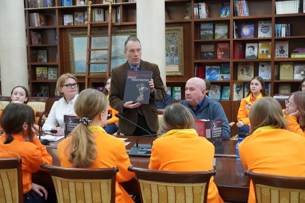 Вторую часть встречи посвятили Юлиану Семенову, о приезде которого в «Артек» хорошо помнят некоторые из старожилов детского лагеря. Историк Алексей Репин рассказал о работе над своей фундаментальной биографией легендарного журналиста и писателя «Юлиан Семенов: от Витквича к Штирлицу», вышедшей в свет в Оренбургском книжном издательстве им. Г.П. Донковцева, подарил несколько книг для юных читателей библиотеки. По давней традиции почетных гостей посвятили в артековцы, повязав им красные пионерские галстуки.