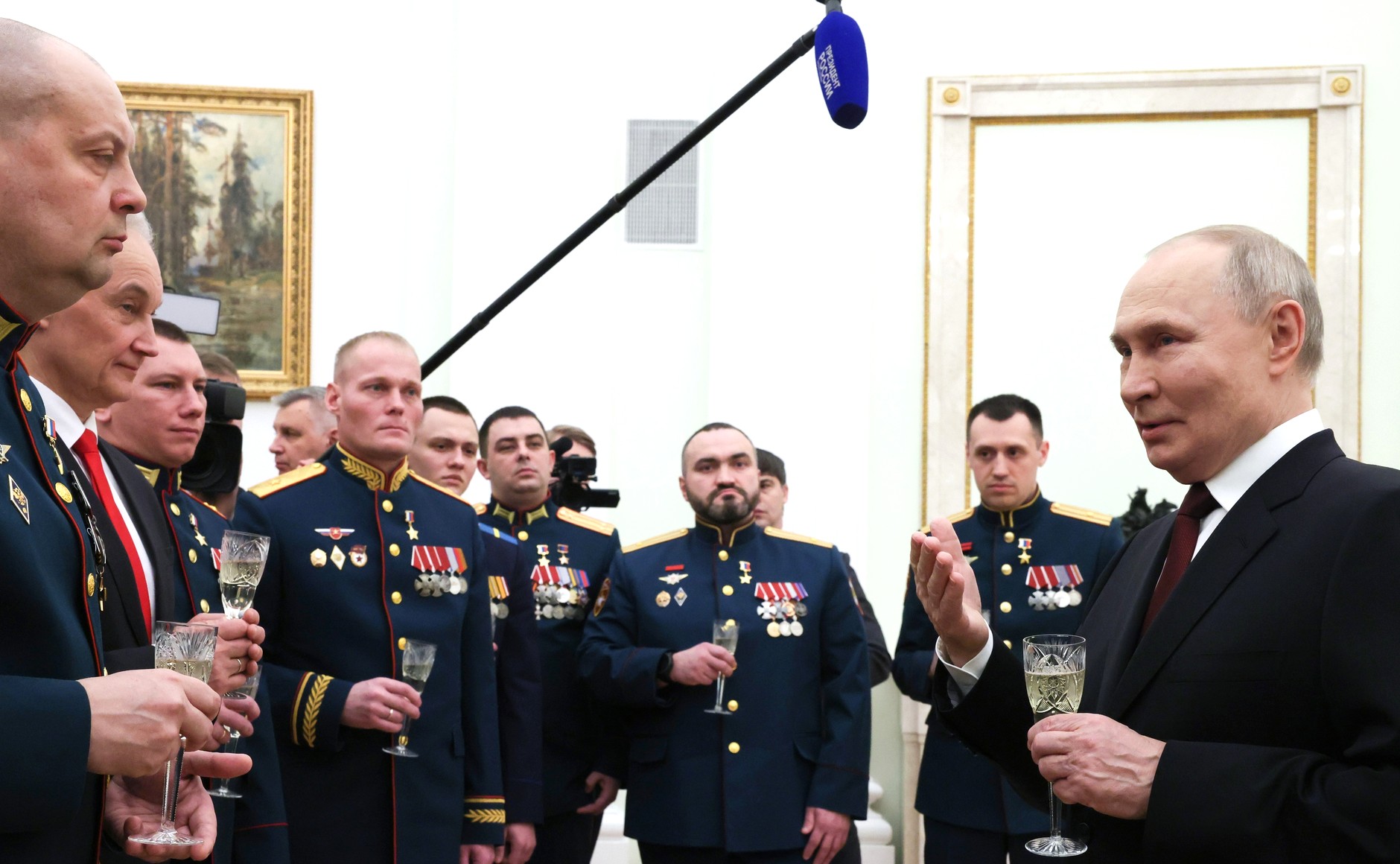 — Сегодня, здесь, в Кремле мы чествуем людей исключительной доблести, верности и чести. Я рад поздравить вас с заслуженным призванием, с орденами и вручить вам «Золотые звёзды» Героев Российской Федерации. Все вы по праву удостоены этого высокого звания. Ваша служба связана с решением боевых задач, с продвижением наших войск на самых сложных рубежах и стратегических направлениях. Она сопряжена с огромным риском и высочайшей ответственностью за личный состав вверенных вам подразделений, за ваших боевых товарищей, за мирных жителей наших городов и сёл, — сказал Путин.