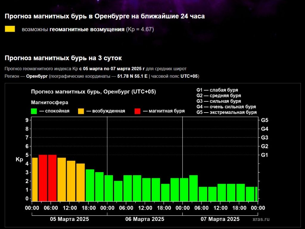 Уровень магнитной бури – G1. Это самая слабая из всех возможных. Буря достигла пика к 5 часам утра по оренбургскому времени. Её активность продлится до 10 утра, а затем она пойдёт на спад.