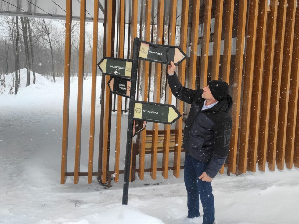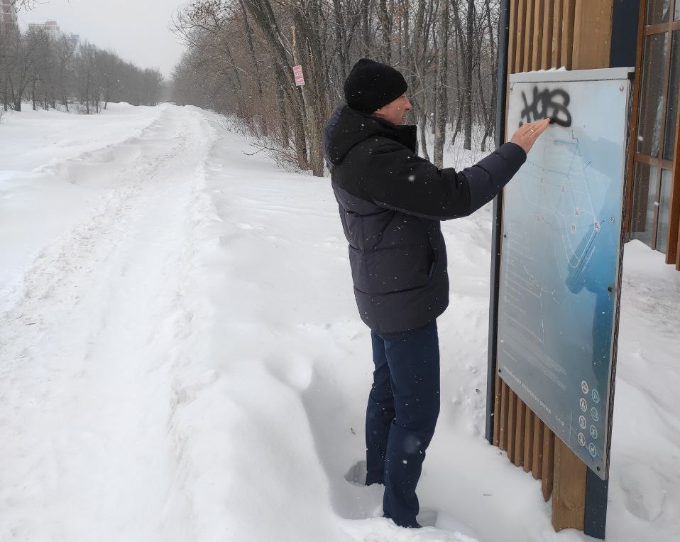 Вячеслав Объедков проверил как коммунальные службы занимаются уборкой снега и осмотрел входные группы у парка «Березка». Вандалы уже успели испортить указатели и разрисовать информационные баннеры.