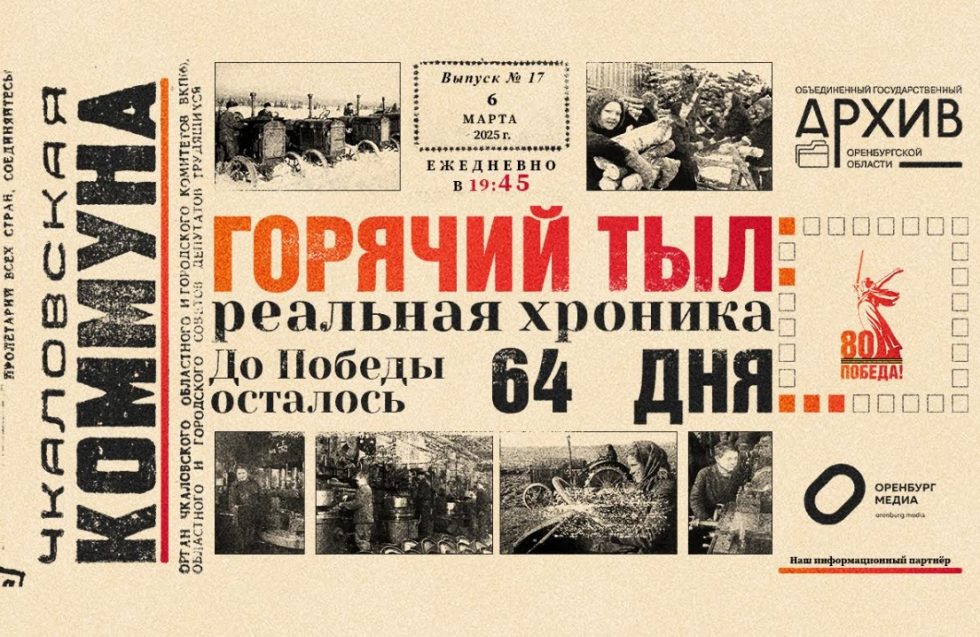 Проект «Горячий тыл: реальная хроника» подготовлен архивной службой Оренбургской области и посвящен 80-летию Победы в Великой Отечественной войне. Оренбург Медиа — информационный партнер проекта.