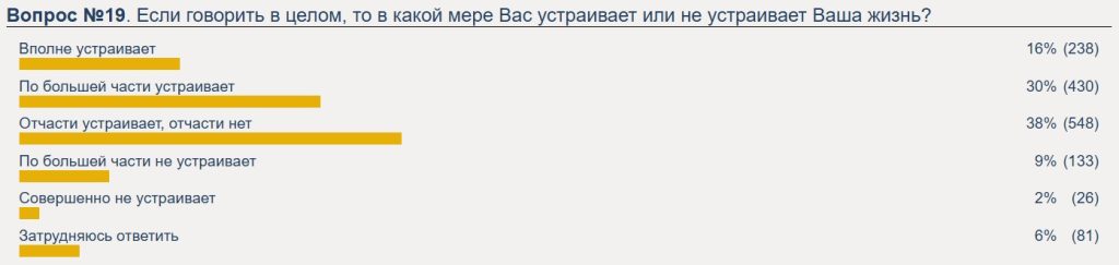 Самым популярным ответом на вопрос, устраивает ли оренбуржцев их жизнь, стал «Отчасти устраивает, отчасти нет» (38%). Полностью довольны своей жизнью 16% опрошенных, совершенно недовольны — 2%.