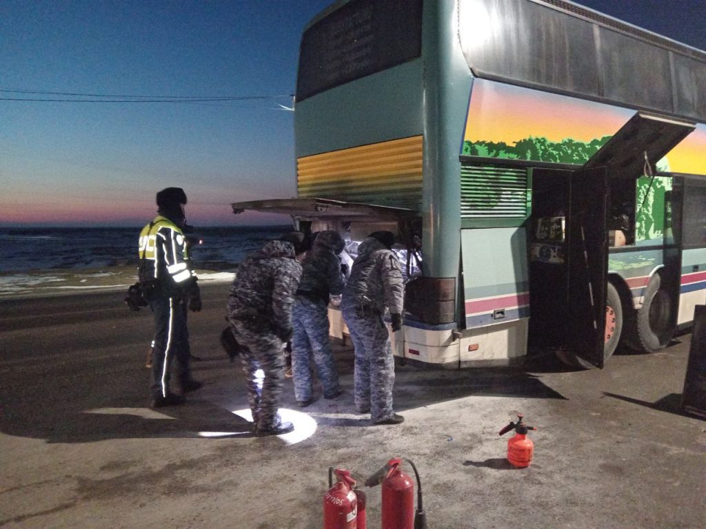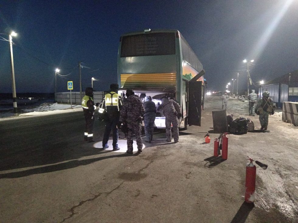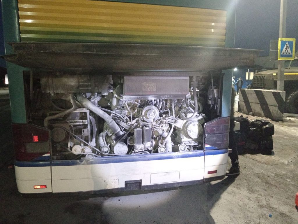 Инцидент произошел на контрольно-пропускном пункте. Лейтенант полиции Михаил Шиварев обратил внимание на густой дым, который валил от двигателя через решетку радиатора. При этом водитель автобуса пожар не заметил.
