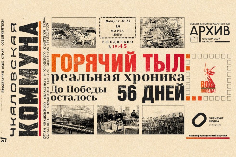Проект «Горячий тыл: реальная хроника» подготовлен архивной службой Оренбургской области и посвящен 80-летию Победы в Великой Отечественной войне. Оренбург Медиа — информационный партнер проекта.
