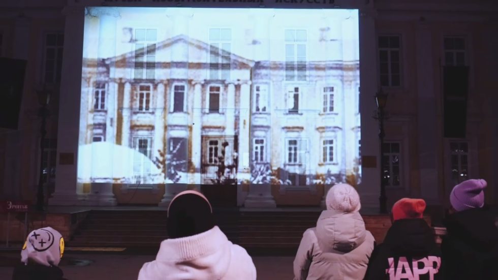 Оренбургский музей ИЗО отмечает 65-летие. В честь события на фасаде здания музея на улице Каширина показали целую историческую эпоху.