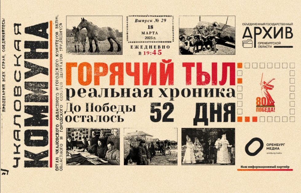 Проект «Горячий тыл: реальная хроника» подготовлен архивной службой Оренбургской области и посвящен 80-летию Победы в Великой Отечественной войне. Оренбург Медиа — информационный партнер проекта.