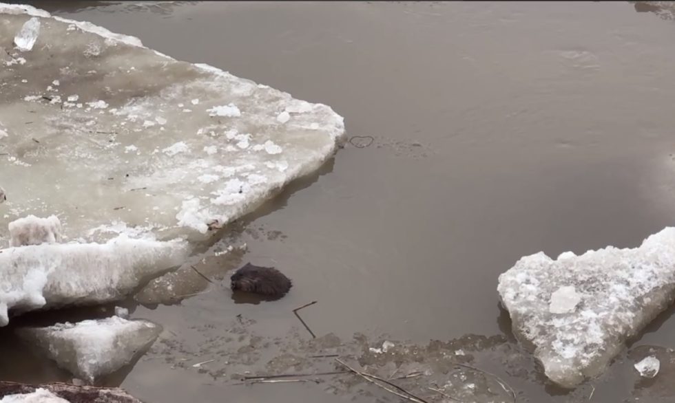 Ондатра попала в кадр в момент перекуса. Мускусная крыса нашла в воде травинку, которой, вероятно, и отобедала. В холодной речной воде среди льдин зверек чувствует себя вполне комфортно.
