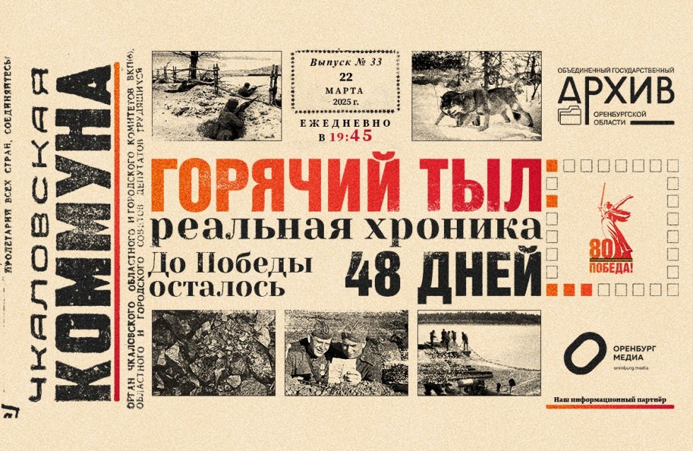 Проект «Горячий тыл: реальная хроника» подготовлен архивной службой Оренбургской области и посвящен 80-летию Победы в Великой Отечественной войне. Оренбург Медиа — информационный партнер проекта.