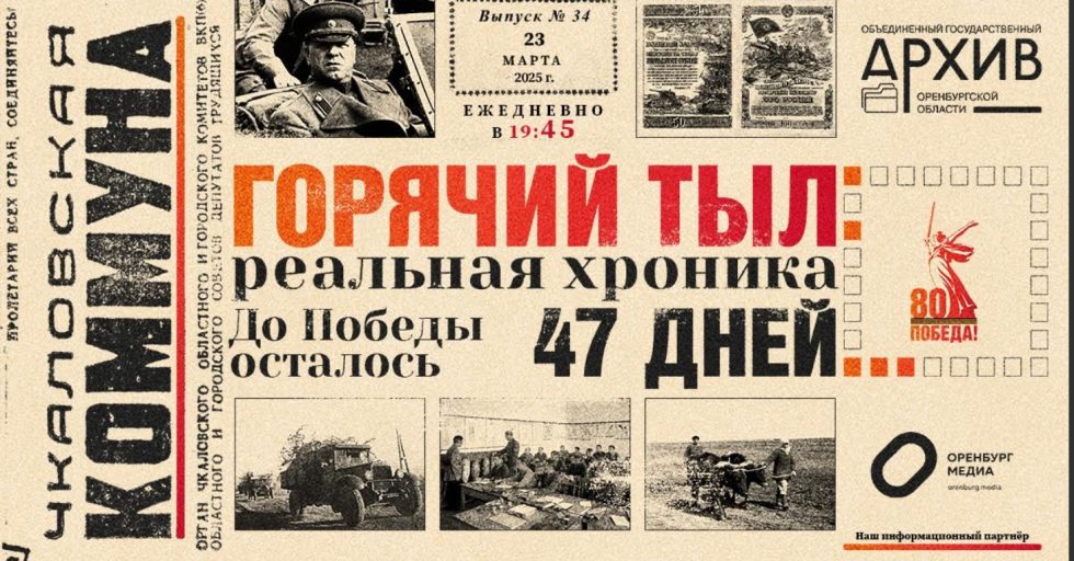 Проект «Горячий тыл: реальная хроника» подготовлен архивной службой Оренбургской области и посвящен 80-летию Победы в Великой Отечественной войне. Оренбург Медиа — информационный партнер проекта.