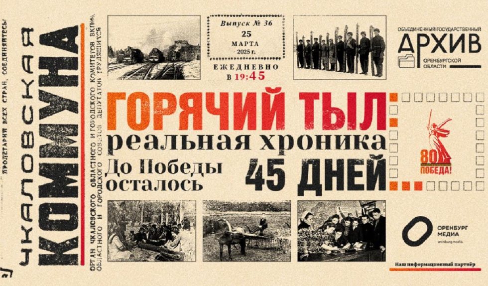 Проект «Горячий тыл: реальная хроника» подготовлен архивной службой Оренбургской области и посвящен 80-летию Победы в Великой Отечественной войне. Оренбург Медиа — информационный партнер проекта.