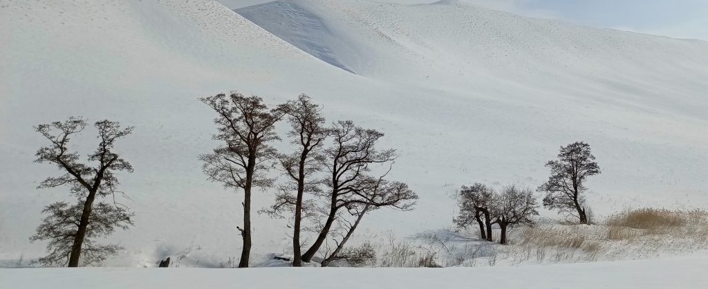 Дмитрий Степанов с фотографией черных стволов ольхи на фоне белой стены Долгих гор вошёл в финал номинации «Телефонофото».