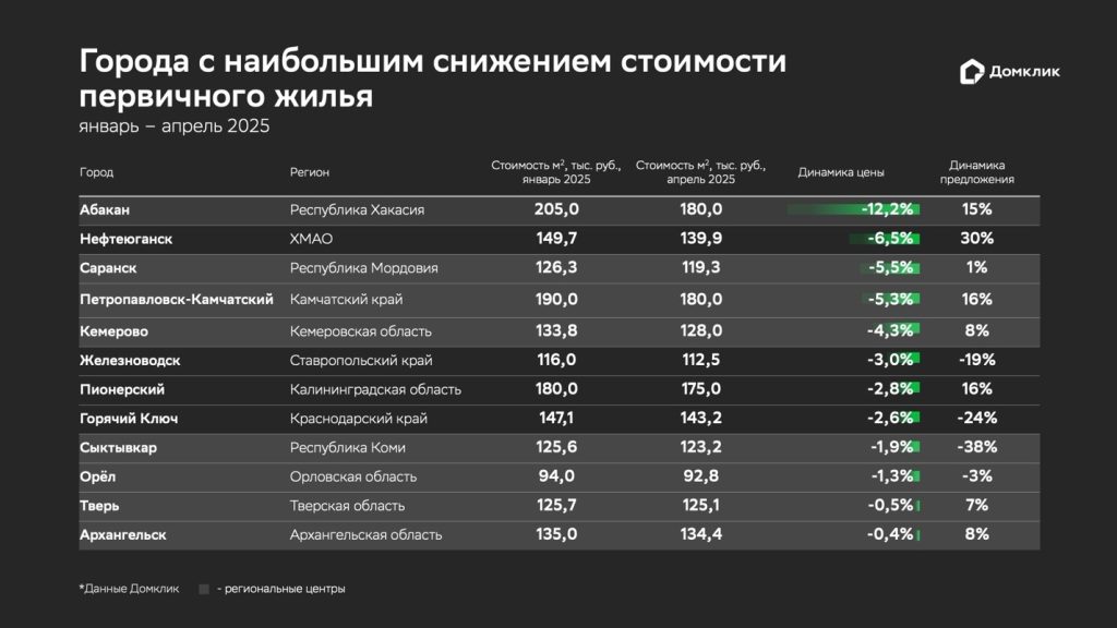 Города с наибольшим снижением стоимости первичного жилья