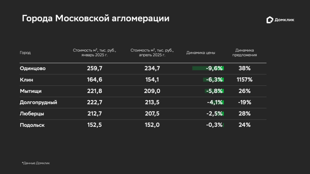 На основе этих данных аналитики вычислили разницу в медианной стоимости квадратного метра новостроек за период с начала января 2025 года по конец апреля 2025 года и выделили города, в которых снизились цены за указанный временной промежуток. Дополнительно аналитики рассчитали ценовую динамику в городах Московской агломерации.