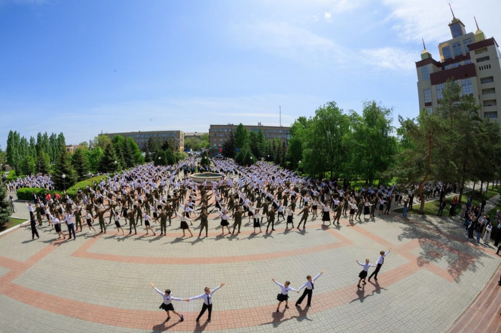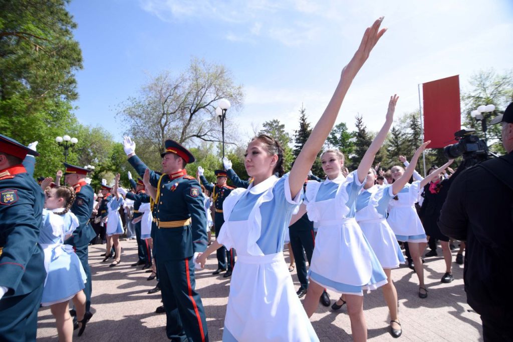 Сегодня же студенты десяти вузов Оренбуржья исполнили «Вальс Победы» на площади ОГУ. «Майский вальс» закружил в едином ритме 350 пар. В акции также приняли участие курсанты военного учебного центра имени дважды Героя Советского Союза генерал-полковника А.И. Родимцева при ОГУ.