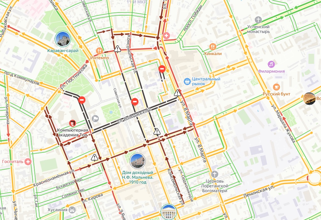 Водители в попытке объехать перекрытые улицы простаивают на прилегающих перекрестках. На онлайн-картах пробок центр города буквально «почернел».