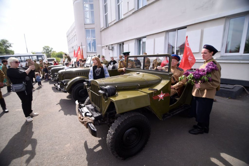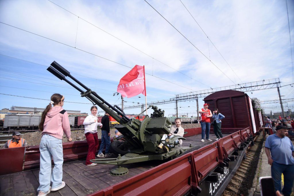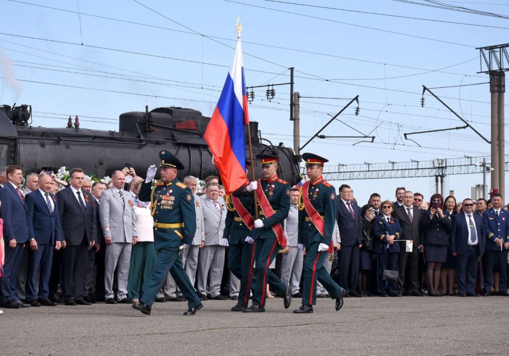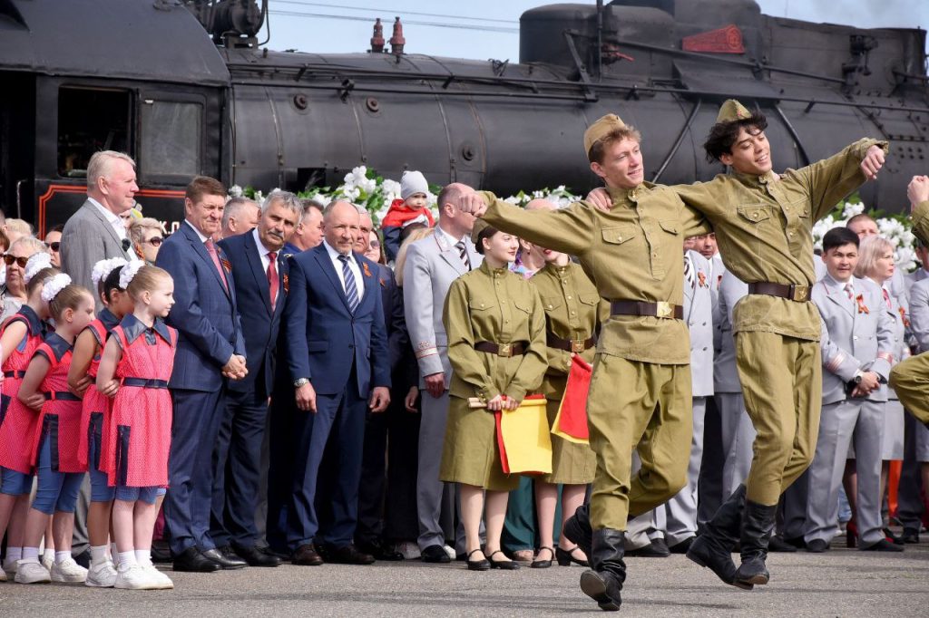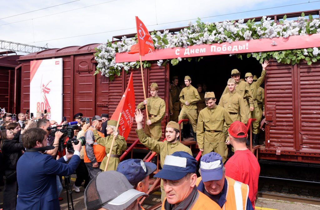 Ретропоезд на паровой тяге, украшенный цветами и символикой 80-летия Победы прибыл в областной центр утром 7 мая. В составе локомотива серии Л на перрон прибыли «теплушки» с артистами в форме военных лет. Они представили мини-спектакль на перроне.