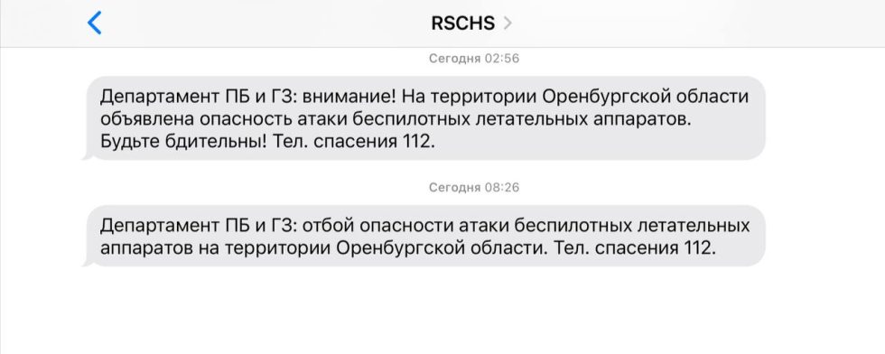 Департамент ПБ и ГЗ Оренбургской области разослал жителям региона СМС об угрозе беспилотников.