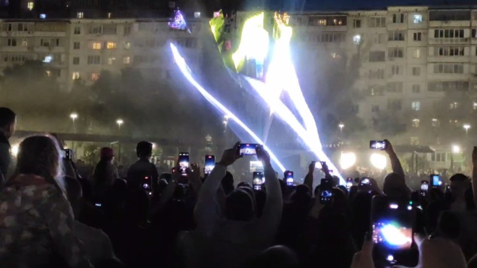Световые иллюминации включили у самого большого фонтана города. 15-метровые струи сопровождались музыкой и лазерными инсталляциями.