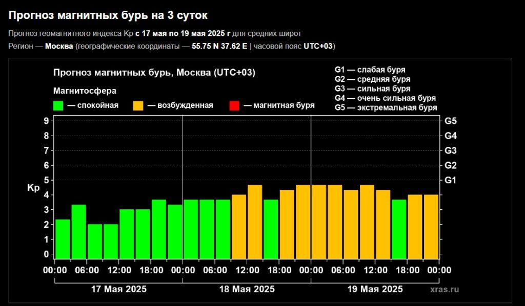 Завтра, 18 мая, уровень магнитной бури – G1. Это самая слабая из всех возможных. Буря достигнет пика к 13 часам утра по оренбургскому времени. Её активность продлится до вечера и пойдёт на спад.