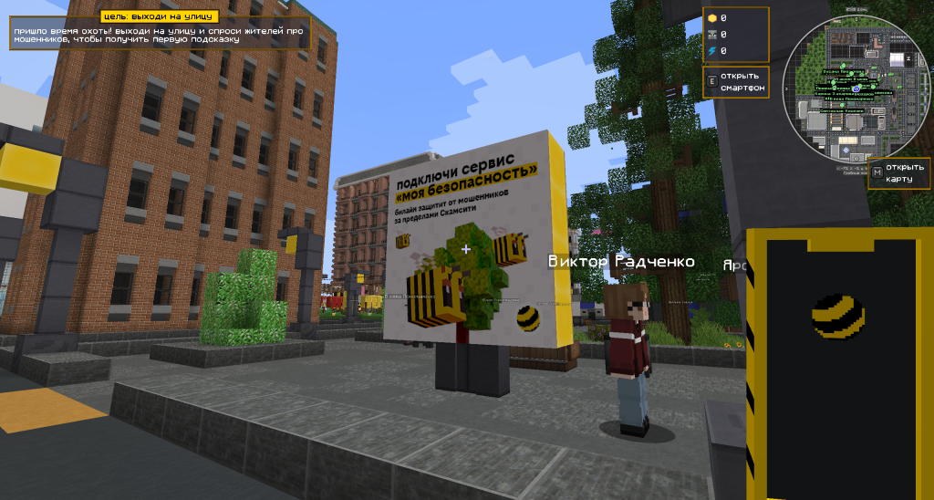 Суть игры: участники становятся охотниками на мошенников и исследуют огромный виртуальный город ScamCity. Они распознают схемы мошенничества и ловят злоумышленников, с помощью бустеров безопасности в своих виртуальных смартфонах. Чтобы понять схему, нужно сначала поговорить с жертвой и узнать детали преступления. Участники будут общаться с NPC-жителями, способными поддерживать разумный диалог с помощью ChatGPT, и узнают реальные истории обмана. Всё, как в жизни, только в кубическом мире Minecraft.