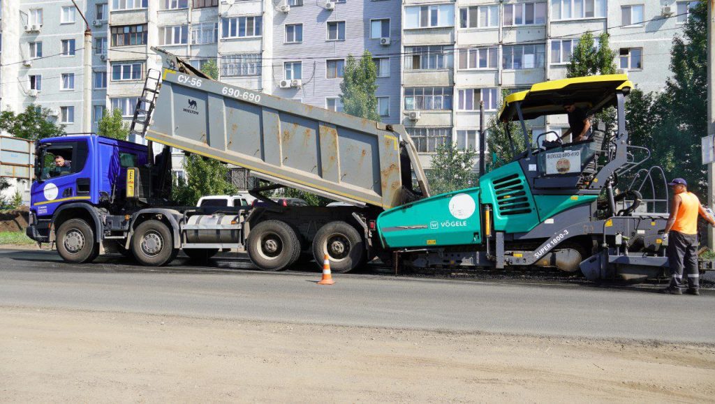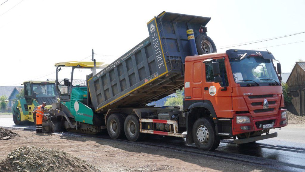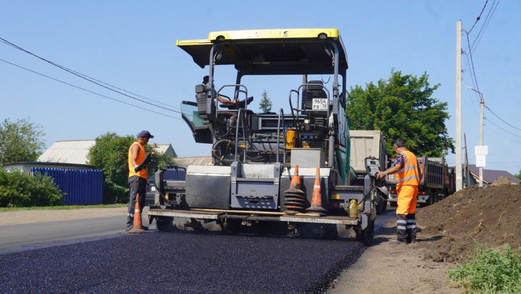 На участке проезжей части протяженностью почти километр в настоящее время укладывают верхний слой асфальта.