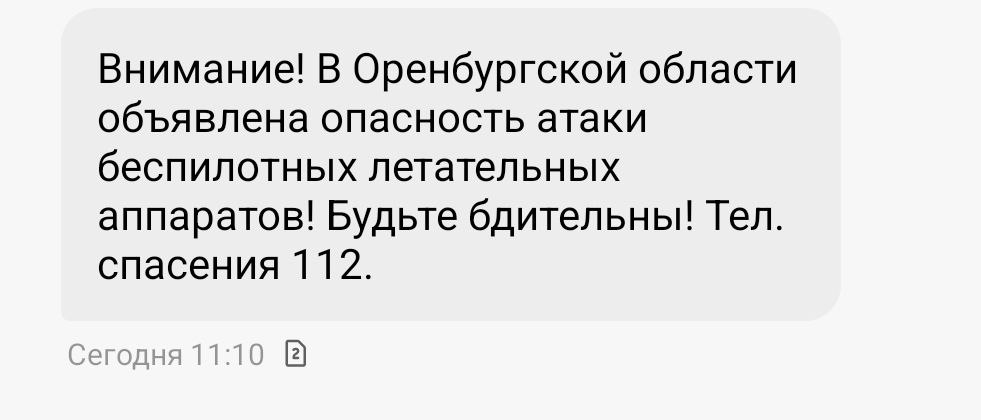 Как писал «Оренбург Медиа», СМС-оповещения об угрозе БПЛА поступают на телефоны оренбуржцев не одновременно. Операторы в разных населенных пунктах присылают их с разрывом по времени.